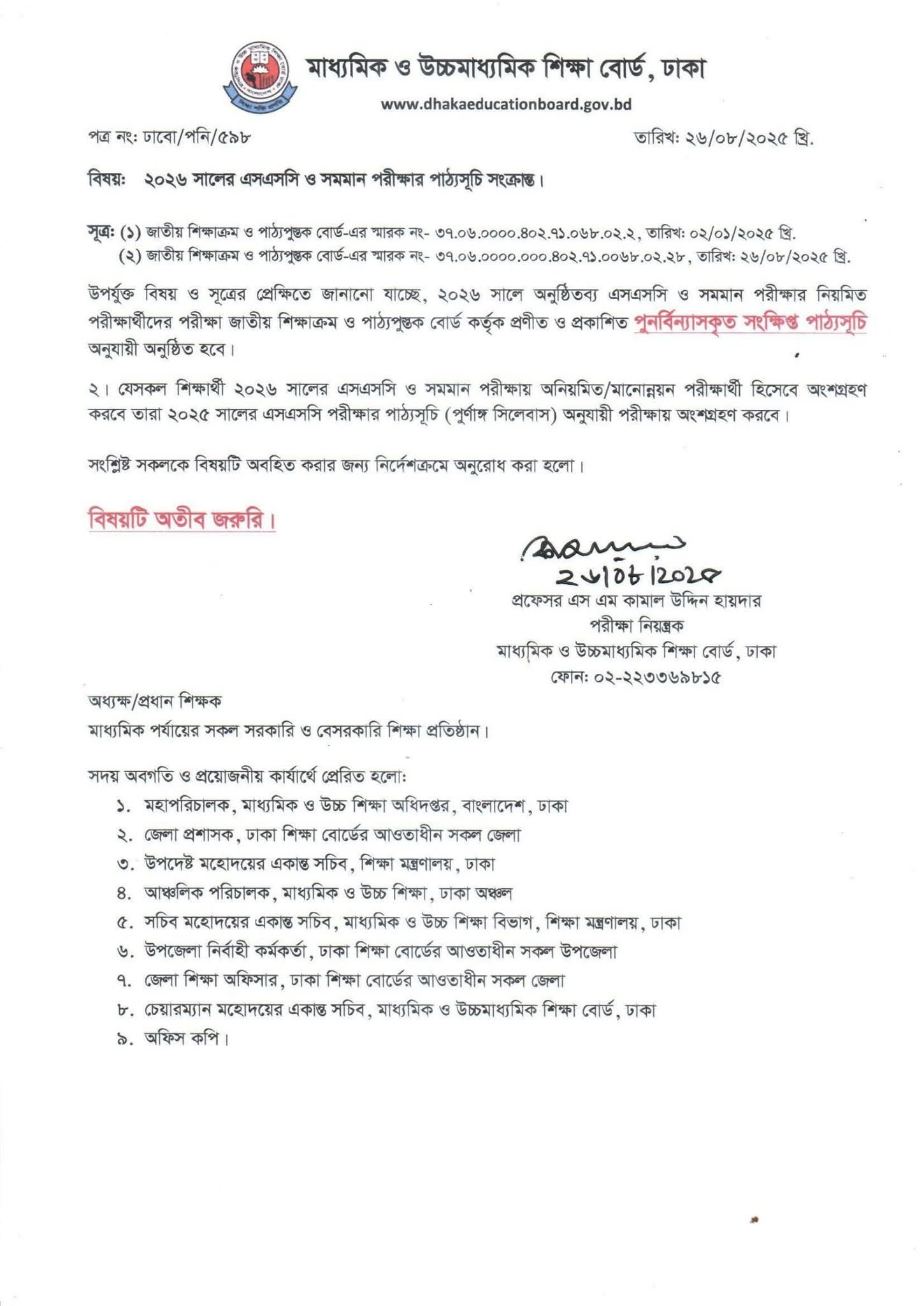 08/27/2025 যে সকল শিক্ষার্থী ২০২৬ সালের এসএসসি ও সমমান পরীক্ষায় অনিয়মিত/মান উন্নয়ন পরীক্ষার্থী হিসেবে অংশগ্রহণ করবে তারা ২০২৫ সালের এসএসসি পরীক্ষার পাঠ্যসূচি অনুযায়ী (পূর্ণাঙ্গ সিলেবাস) অনুযায়ী পরীক্ষায় অংশগ্রহণ করবে।